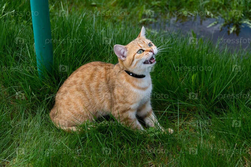 Красивая домашняя кошка гуляет по улице в теплое время года