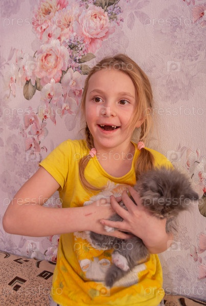 The girl is holding a little beloved pet kitten of the Turkish Angora breed in her arms Девочка держит в руках своего любимого домашнего котенка турецкой породы ангоры
