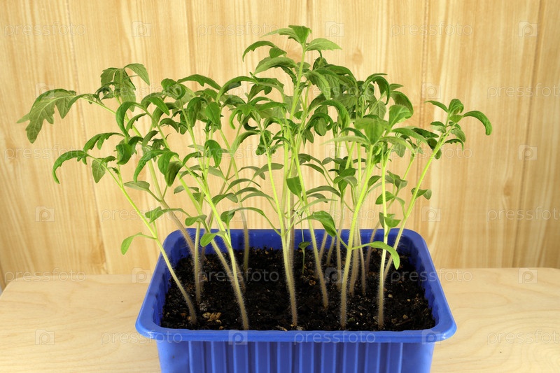Переросшая рассада томатов в пластиковом контейнере