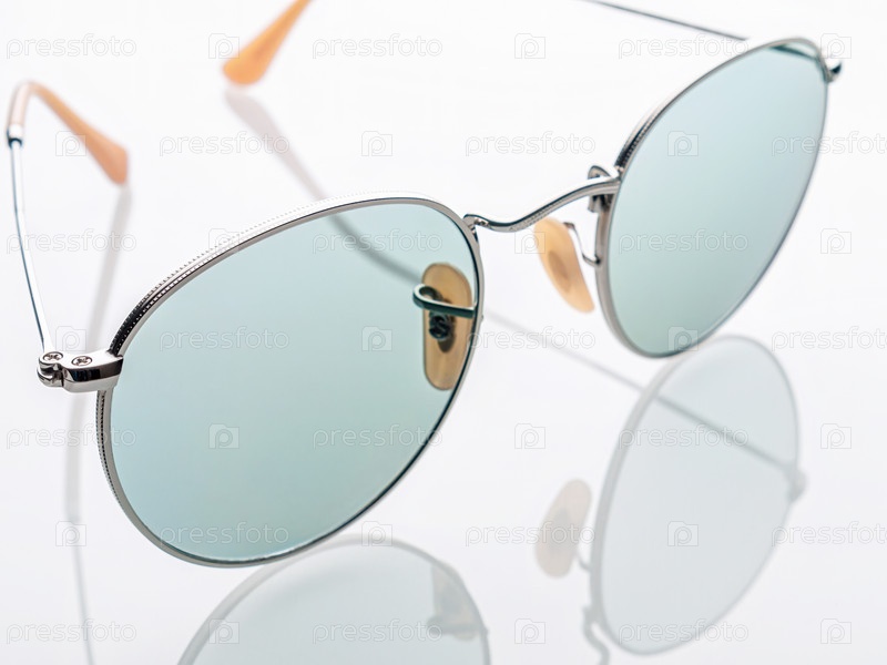 Солнцезащитные очки унисекс со светло-зелеными линзами в классической круглой металлической оправе, изолированной на белом фоне с отражением. Чайные тени, очки Оззи. Никто. Крупный план. Выборочный фокус. Горизонтальный. Студия