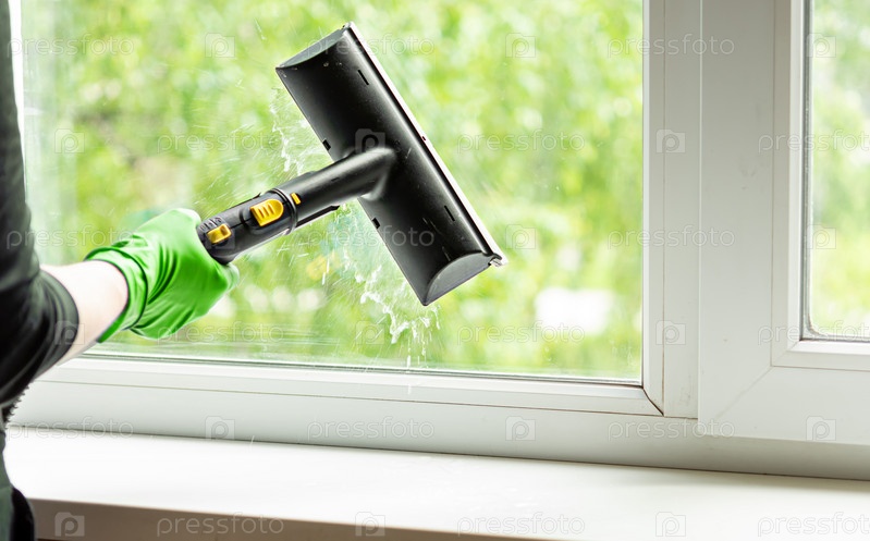 Женщина моет окна дома парогенератором. Весной навести порядок в доме. Уборка дома