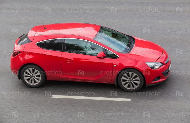 Красный автомобиль движется по асфальтовой дороге