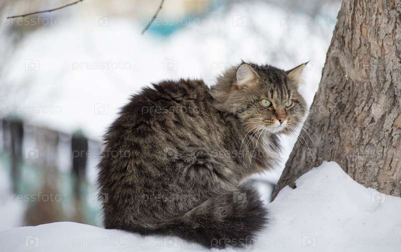 Полосатый дворовый кот на снегу в солнечный зимний день