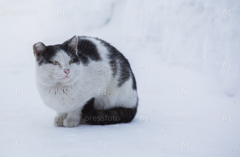 Двор черно-белый кот в снегу