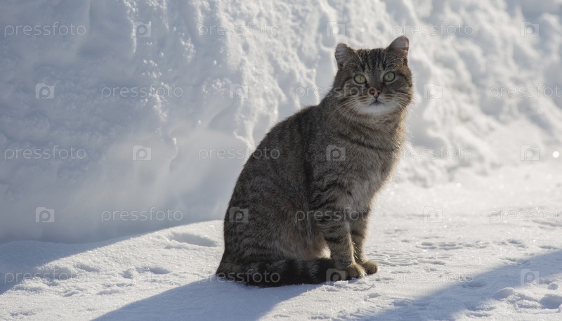 Полосатый дворовый кот на снегу в солнечный зимний день