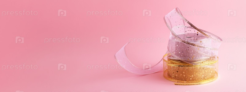 Розовый праздничный веб-баннер с пустым пространством. Ленты для упаковки праздничных подарков, вид спереди
