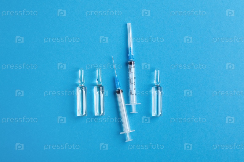 Медицинские стеклянные флаконы и шприцы для инъекций изолированы на синем фоне