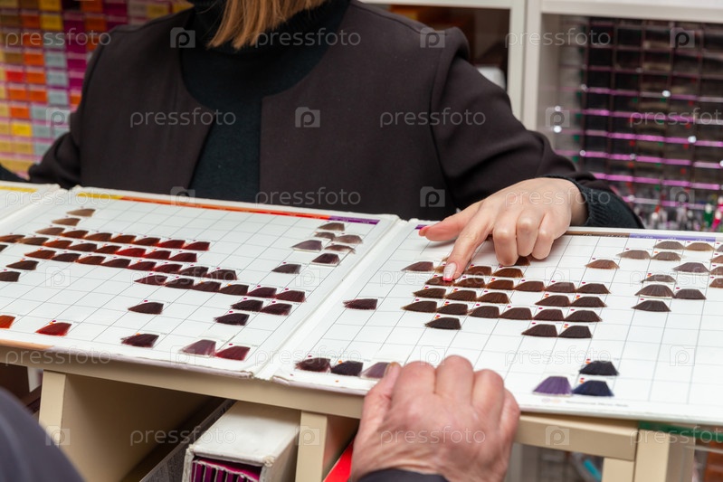 Консультант с каталогом помогает выбрать цвет волос пожилой покупательнице в магазине косметики