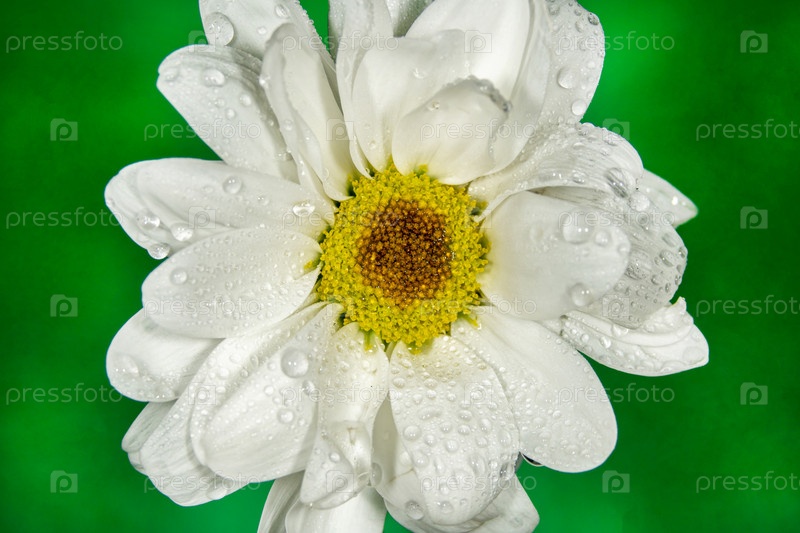 Красивый белый цветок с каплями воды на цветном фоне. Один цветок белой хризантемы
