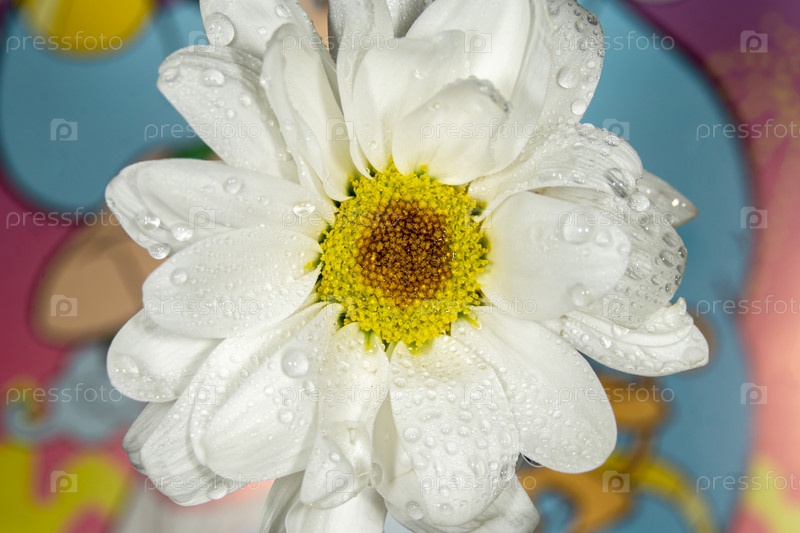 Красивый белый цветок с каплями воды на цветном фоне. Один белый цветок хризантемы