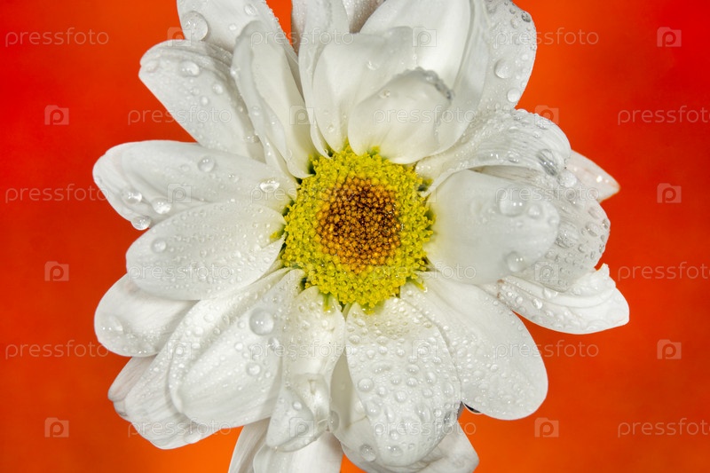 Красивый белый цветок с каплями воды на цветном фоне. Один цветок белой хризантемы
