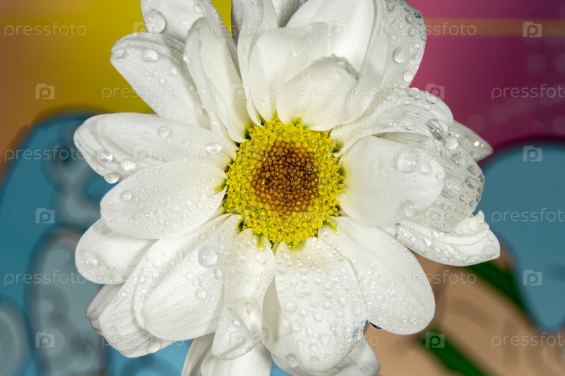 Красивый белый цветок с каплями воды на цветном фоне. Один цветок белой хризантемы