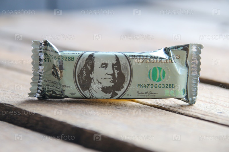 Сто долларов в виде конфет на деревянном фоне. Денежный фон