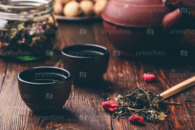 Чайные чаши с чайником и ложкой малинового травяного чая