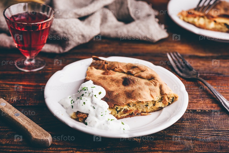 Кусочек капустного пирога со сметанным соусом
