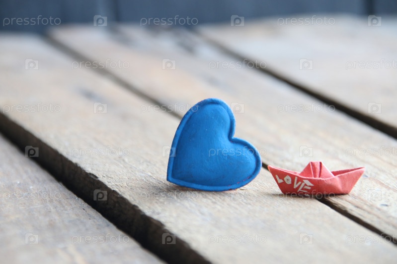 Голубое сердце на деревянном фоне и бумажный кораблик. Место для текста. Валентин. Фон дня рождения