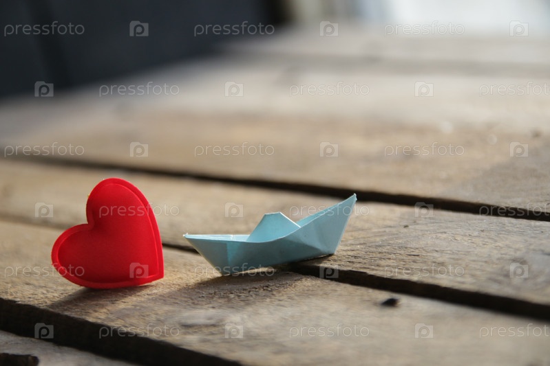 Красное сердце на деревянном фоне и бумажный кораблик. Место для текста. Валентин