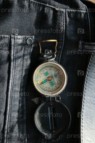 Винтажный компас на джинсах. Концепция поиска - ретро компас в кармане джинсов