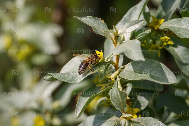 Серебряная ягода, кроличок, лохматый коммутативный фон. Пчела на желтом цвете Silverberry. Серебро оставляет крупный план Silverberry. Садовый декоративный кустарник. Дерево с съедобными плодами