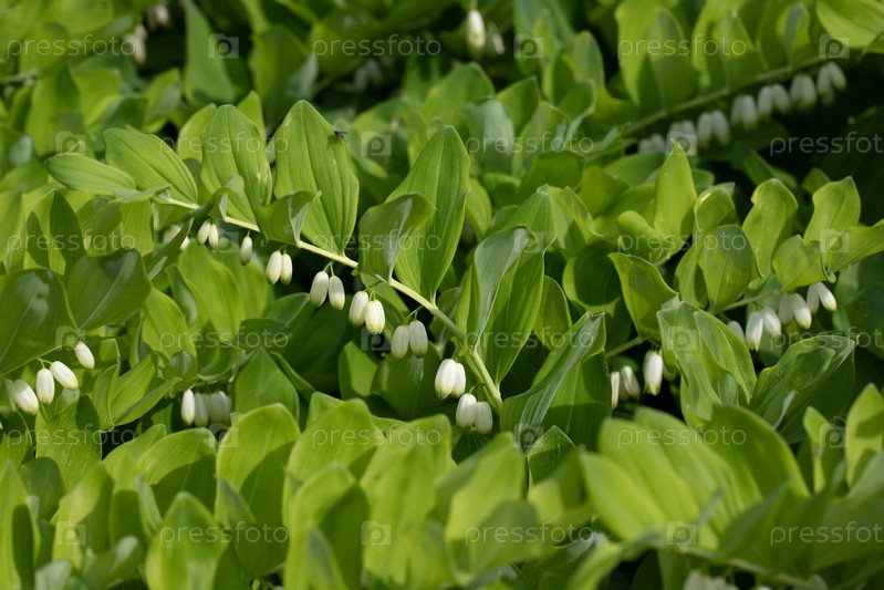 Текстура зеленого листа. Угловая печать Соломона, многоугольник в саду в летний день на зеленом фоне. Многолетнее растение с красивыми белыми цветами