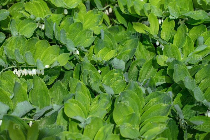 Текстура зеленого листа. Угловая печать Соломона, многоугольник в саду на зеленом фоне. Многолетнее растение с красивыми белыми цветами