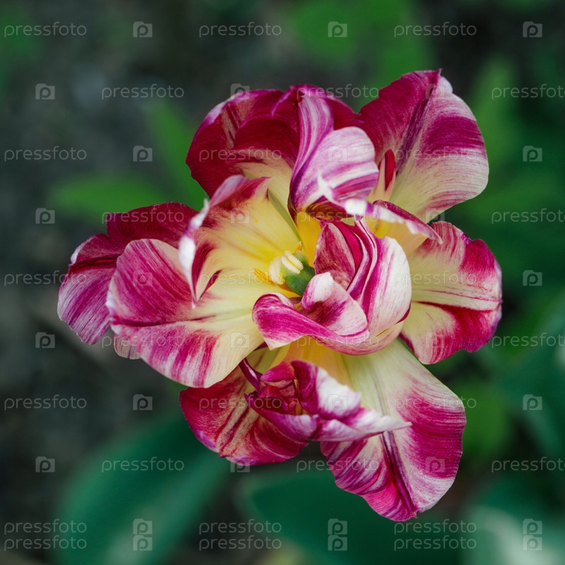 Красивый тюльпан крупным планом, вид сверху. Гибрид махрового тюльпана с розовыми и белыми лепестками. Цветок тюльпана на зеленом естественном фоне