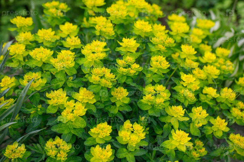 Ярко-желтые кусты молочая на зеленом фоне в саду. Подушковидный молочай, эпитимоидный молочай в солнечный день. Садовые декоративные цветы