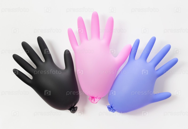 Разноцветные надутые медицинские перчатки на белом фоне. Защита от коронавируса. Концепция личной гигиены