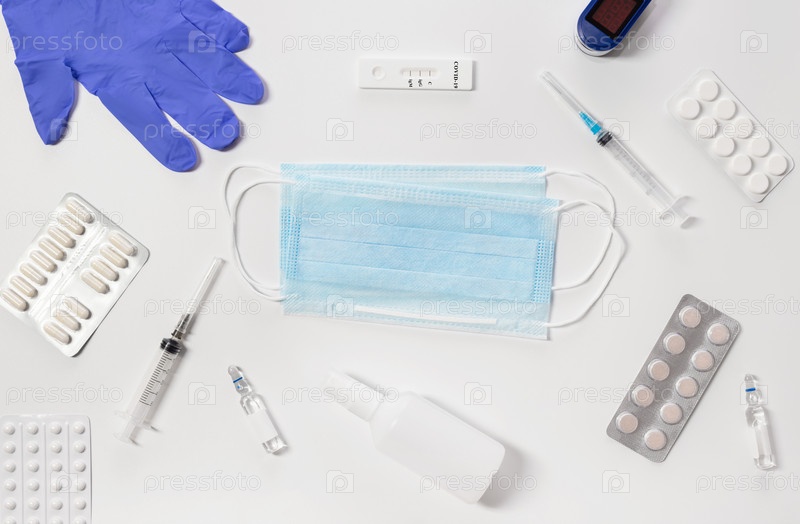 Перчатки, шприц, маска, таблетки и дезинфицирующее средство, тест на белом фоне. Средства для профилактики и лечения коронавируса