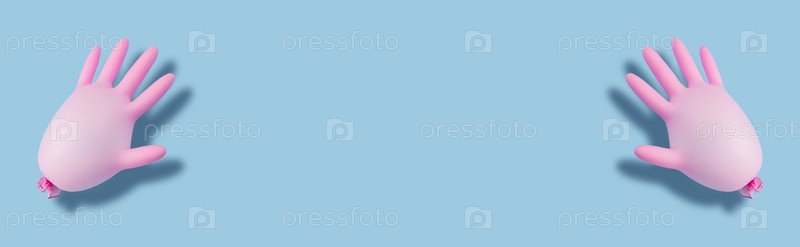 Пара розовых надутых хирургических перчаток на синем фоне. Баннер. Профилактика коронавируса, ковид-19. Концепция минимального здравоохранения