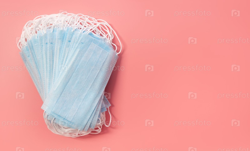 Стол медицинских защитных масок на розовом фоне. Профилактика и защита от вирусов. Коронавирус, концепция covid-19