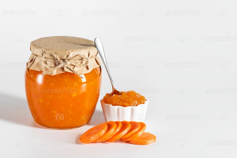 Вкусный домашний морковный джем с лимоном в стеклянной банке на белом фоне