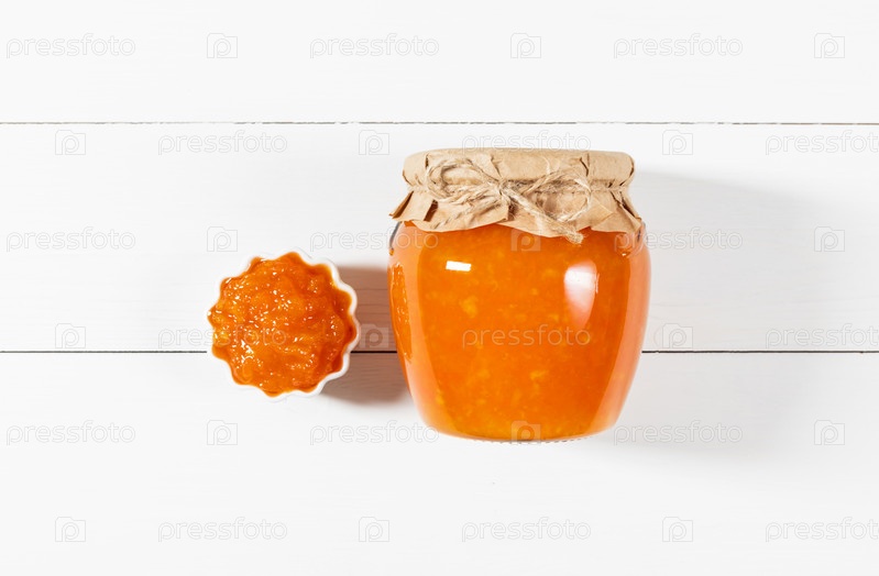 Вкусный домашний джем в стеклянной банке на белом деревянном фоне