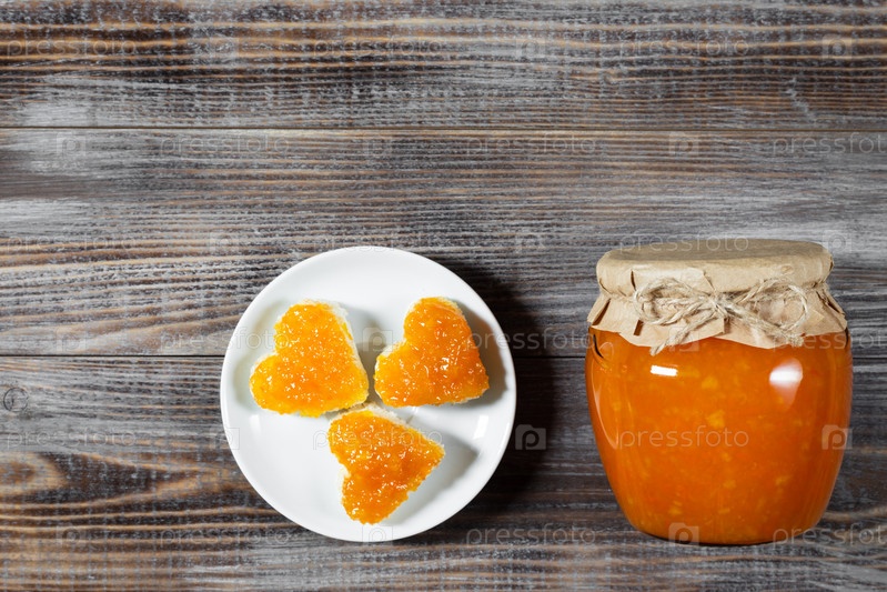 Домашнее варенье в стеклянной банке на темно-коричневом деревянном фоне. Вкусный тост в форме сердца с джемом