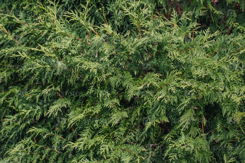 Абстрактный зеленый фон туи. Вечнозеленое хвойное дерево. Текстура листьев туи крупным планом. Декоративное дерево