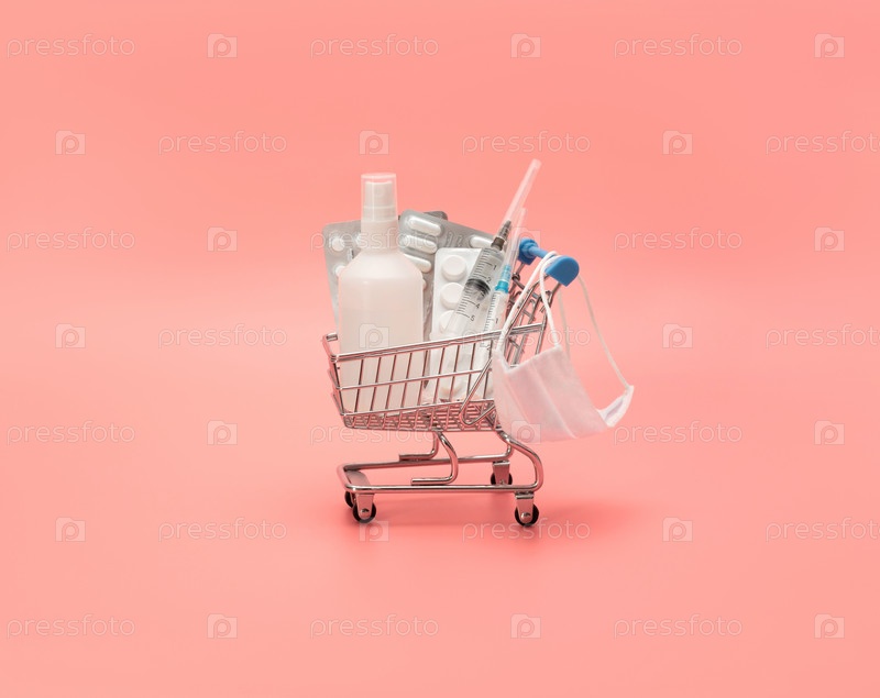 Игрушечная тележка с лекарствами на розовом фоне Коронавирус, концепция covid-19