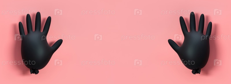 Надутые черные медицинские перчатки на розовом фоне. Баннер. Профилактика коронавируса, ковид-19. Концепция минимального здравоохранения