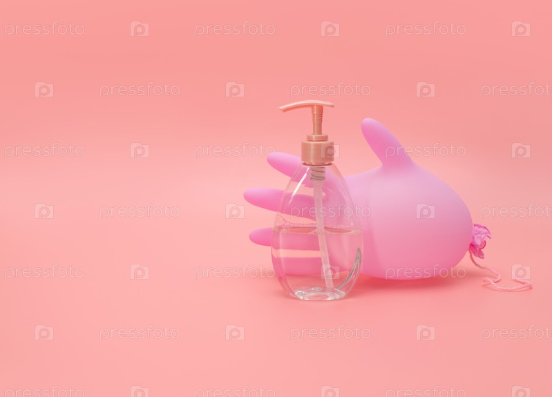 Антибактериальный гель на розовом фоне. Медицинские перчатки и дезинфицирующее средство. Профилактика коронавируса, ковид-19