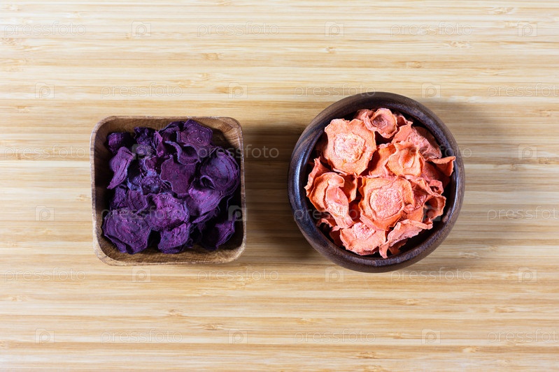 Сушеные чипсы из моркови и свеклы в деревянной миске на разделочной доске. Органическая натуральная пища