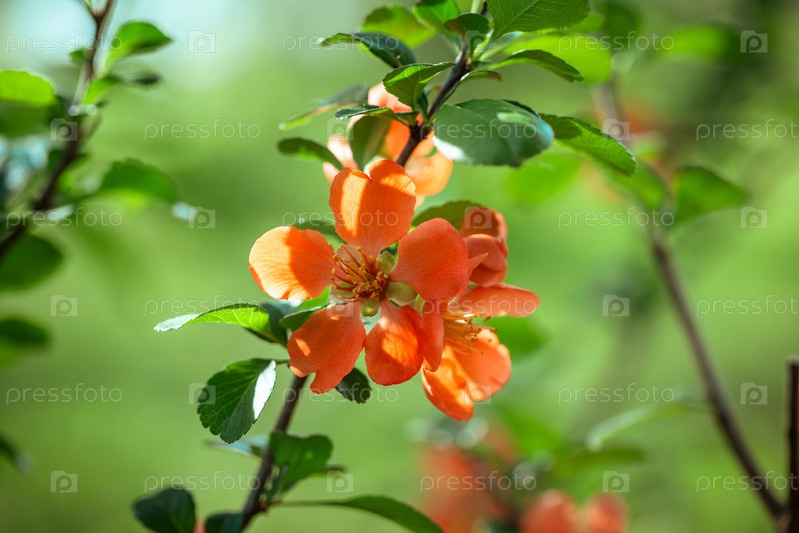 Красивые красные цветы айвы, королева-яблоко, яблочная айва на зеленом фоне в солнечный день. Полезное декоративное плодовое дерево. Макрос крупным планом