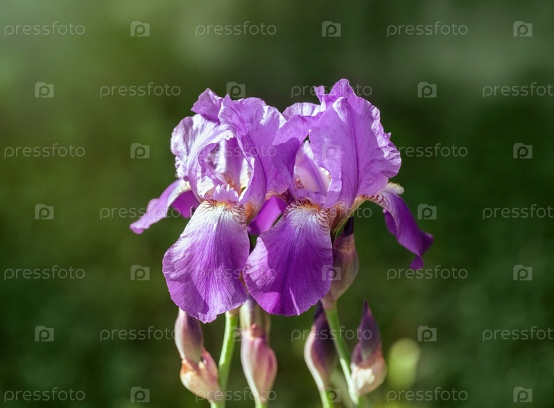 Два фиолетовых ириса в саду. Красивый цветок ирисы сорта Violet Harmony. Фиолетовые ирисы крупный план. Солнечный свет падает на цветки