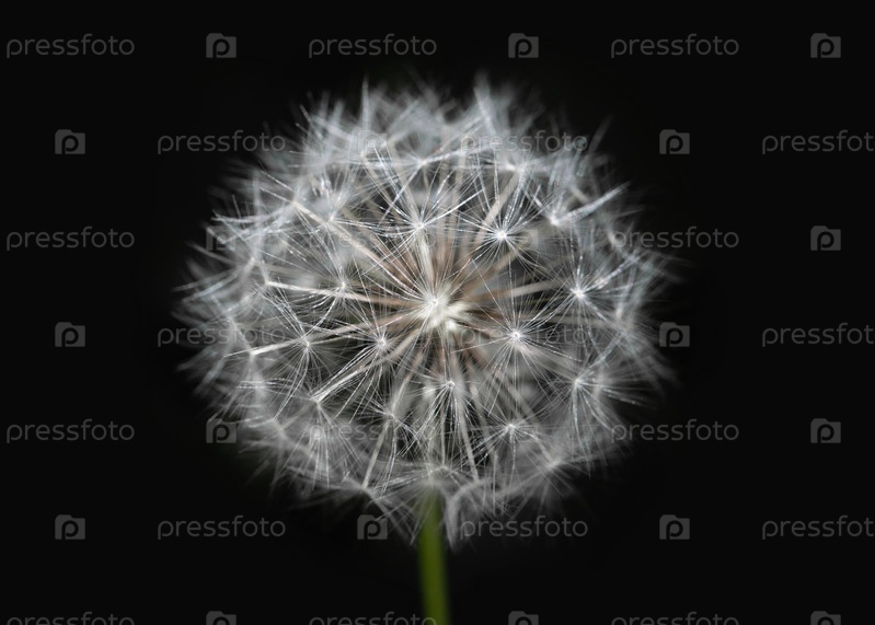 Белый одуванчик на изолированном черном фоне. Пушистые семена одуванчика. Макрос крупным планом одуванчика. Вид сбоку цветущей головки одуванчика