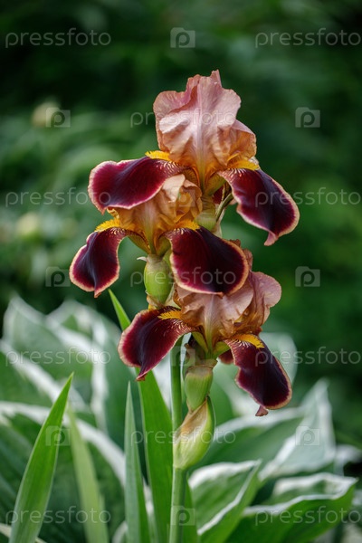 Бургундский цветок ириса крупным планом. Красивый ирис в саду. Цветок для поздравительной открытки и дизайна. Садовое растение