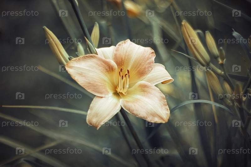Розовая оранжевая лилия на зеленом фоне в крупном плане. лосось Hemerocallis с текстурированными листами. Макрозовый вид сверху. Садовые многолетние растения