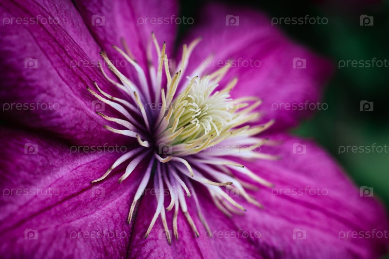Ярко-розовые клематисы крупным планом. Садовые вьющиеся цветы с белыми тычинками. Крупные текстурированные лепестки. Макро вид сбоку. Клематисы на зеленом размытом фоне