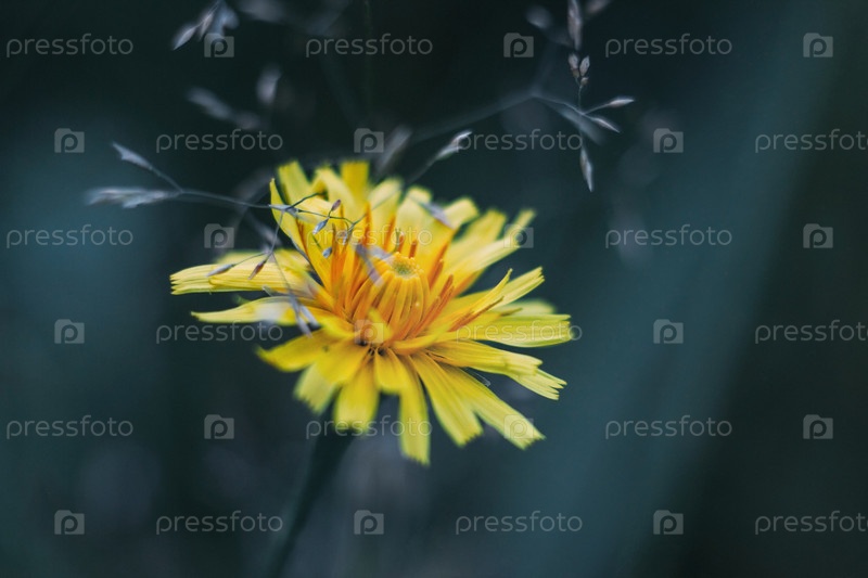 Пушистый желтый цветок одуванчика на синем размытом фоне. Макрос крупным планом. Осенний ястреб