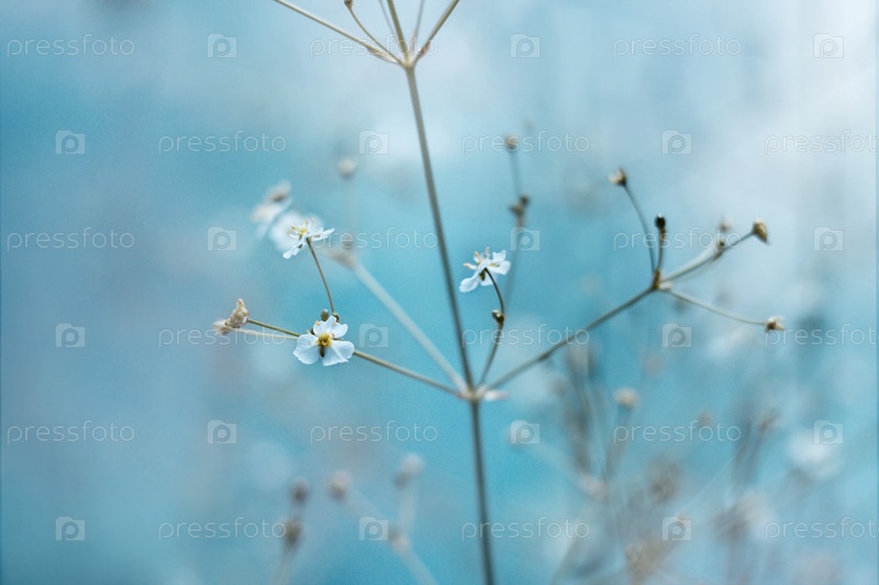 Маленькие белые цветы с желтыми тычинками на голубом фоне. Солнечные лучи падают на цветы в летний день