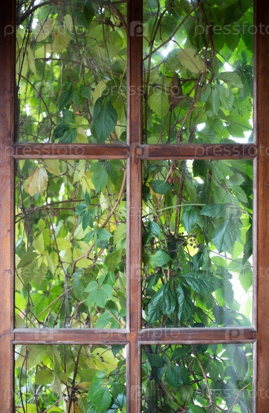 Заросшее окно. Старое деревянное окно, заросшее листьями плюща или партеноциссом. Винтажный стиль