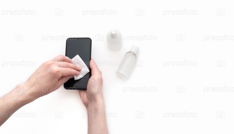 Дезинфекция мобильного телефона изолирована на белом фоне. Мужские руки очищают телефон дезинфицирующим средством. Профилактика коронавируса, ковид-19