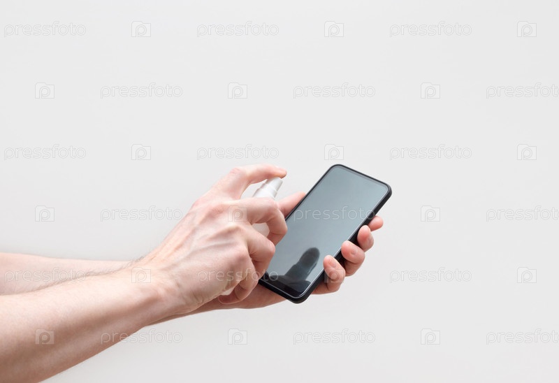 Дезинфекция мобильного телефона на белом фоне. Мужские руки очищают телефон дезинфицирующим средством. Профилактика коронавируса, ковид-19